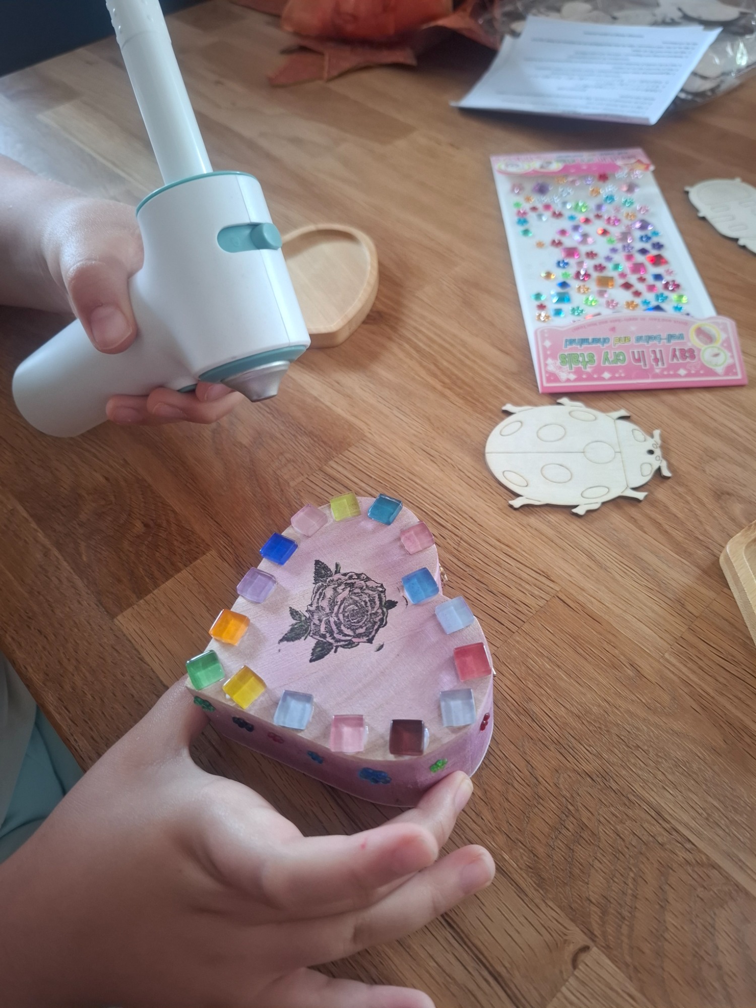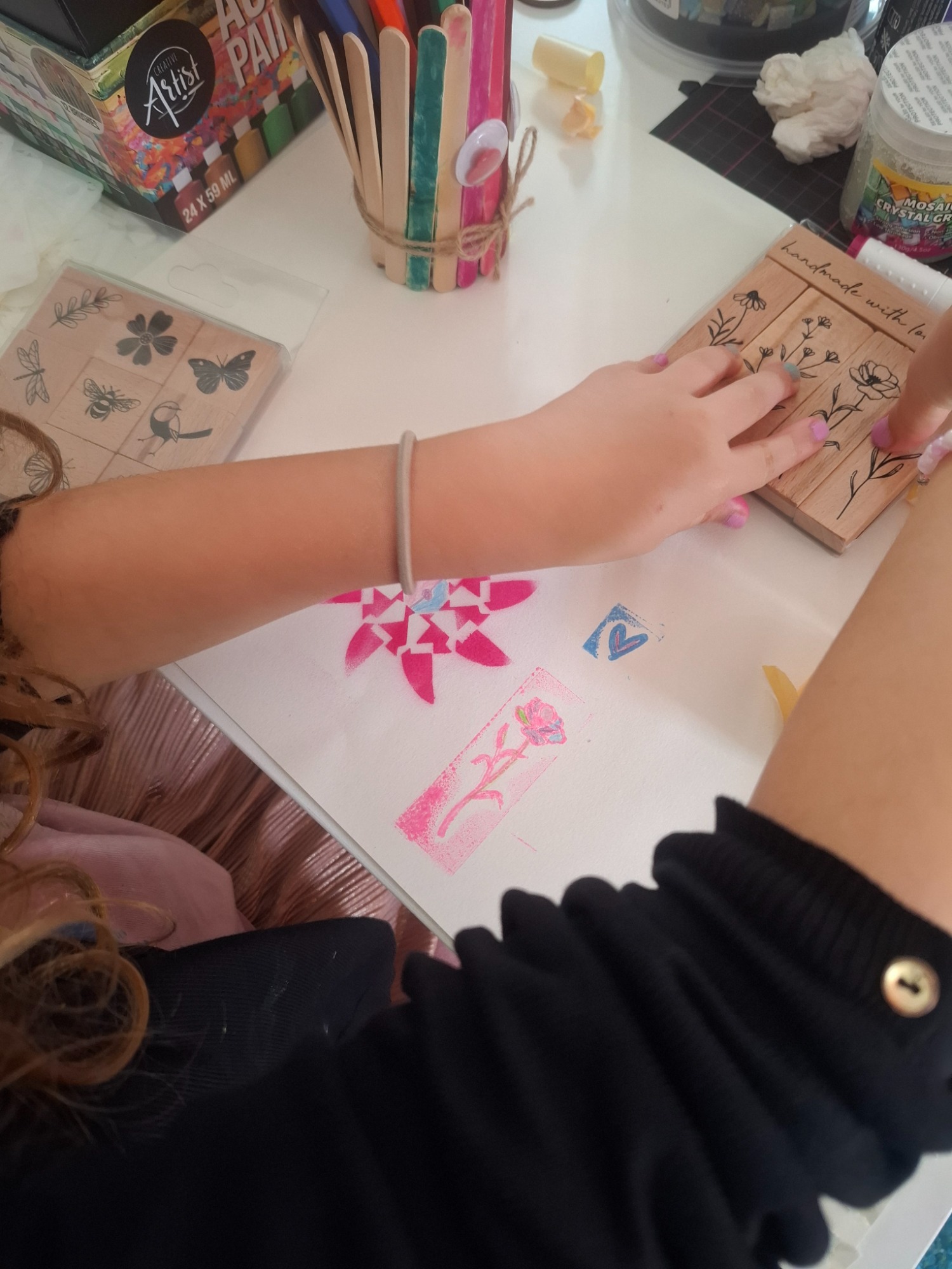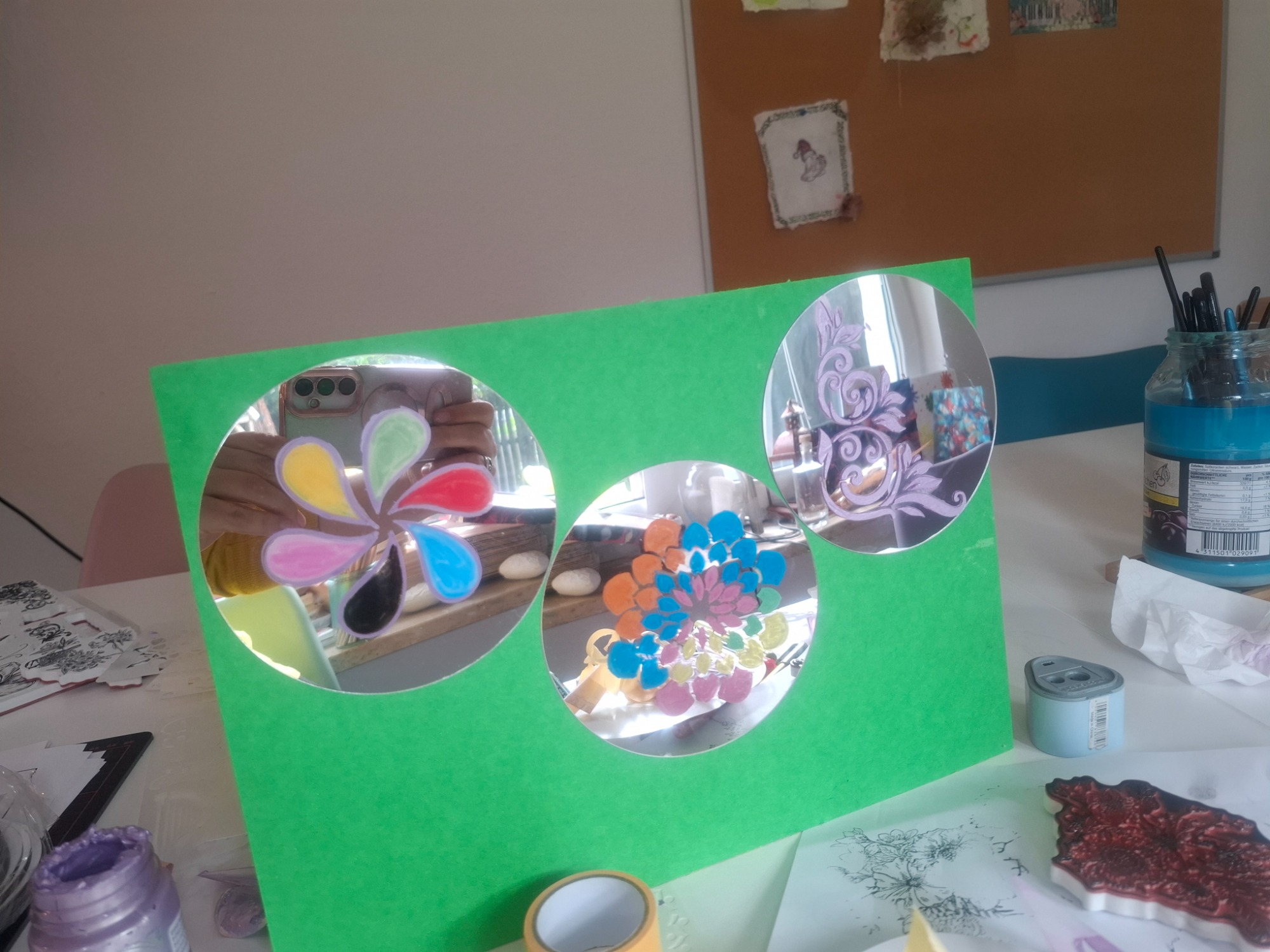 Dabei arbeiten wir mit den verschiedensten Materialien. Unter anderem mit Papier, Dekokarton, Holz, Modelliermasse, Glas, Steine, Textilien und weiteren aktuellen Materialien.