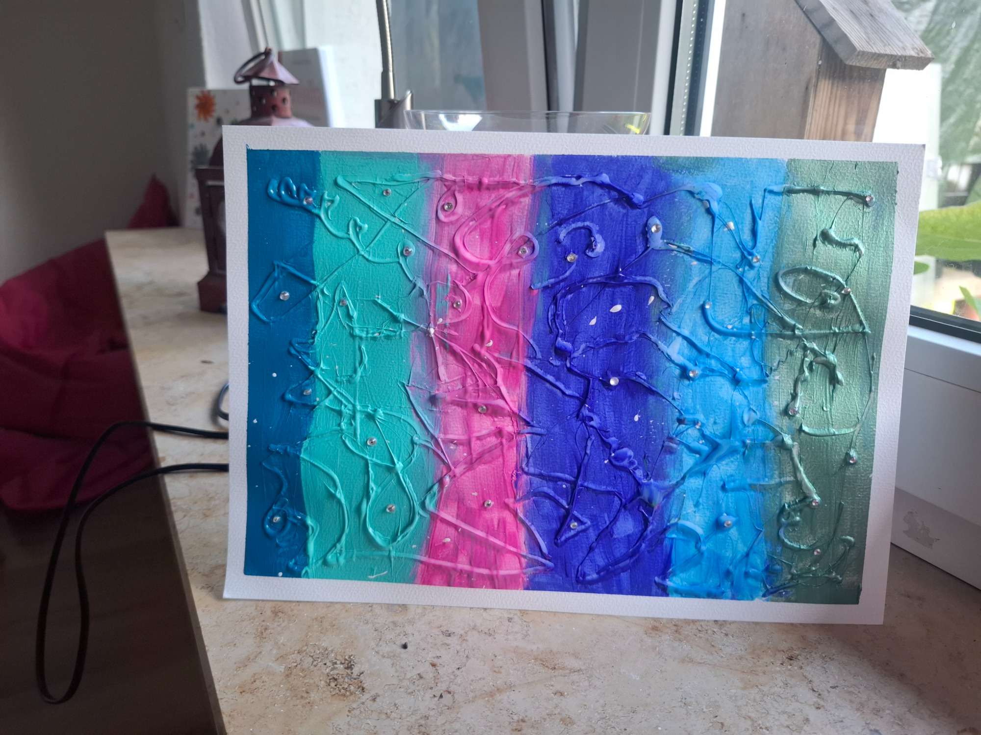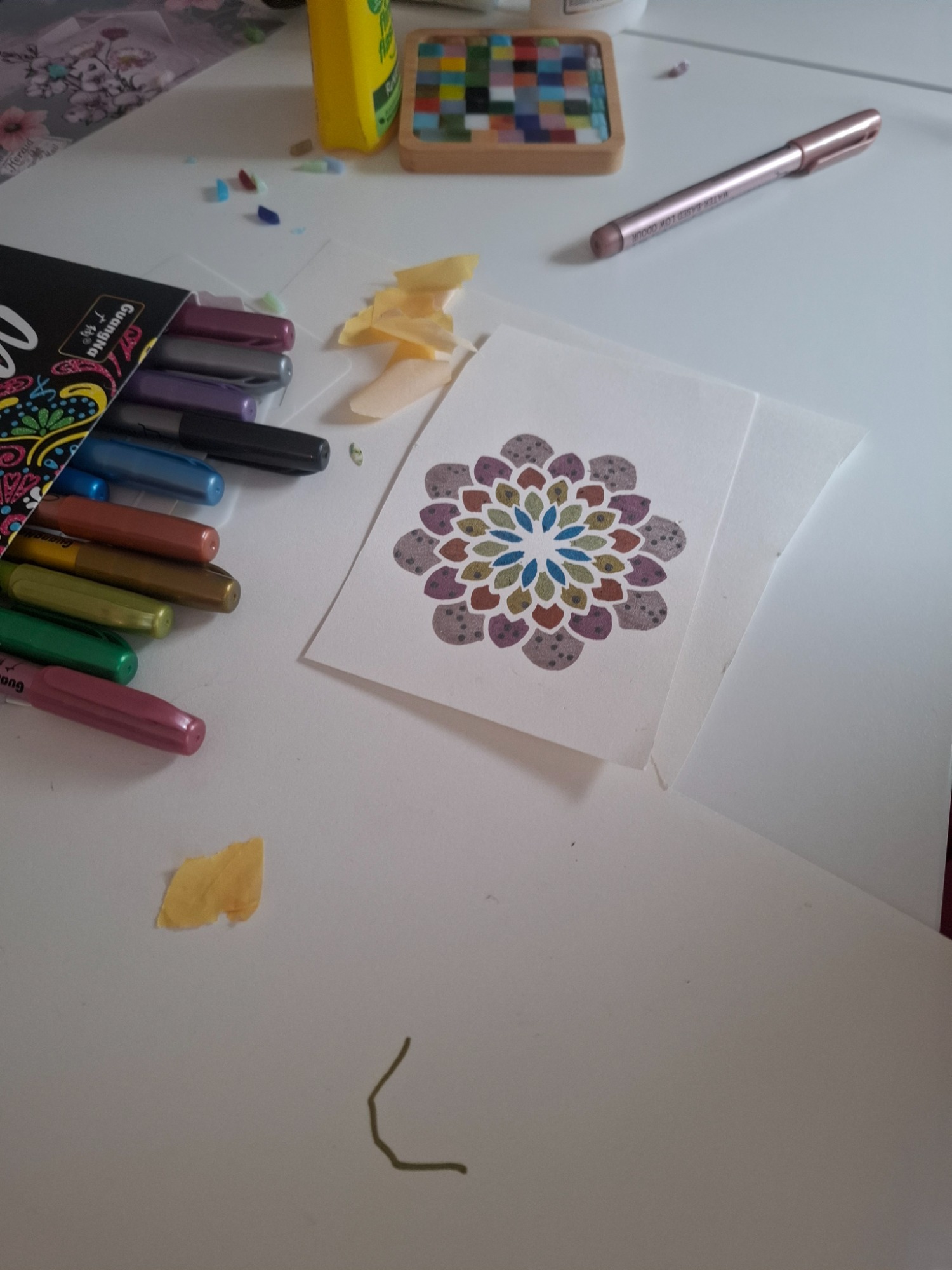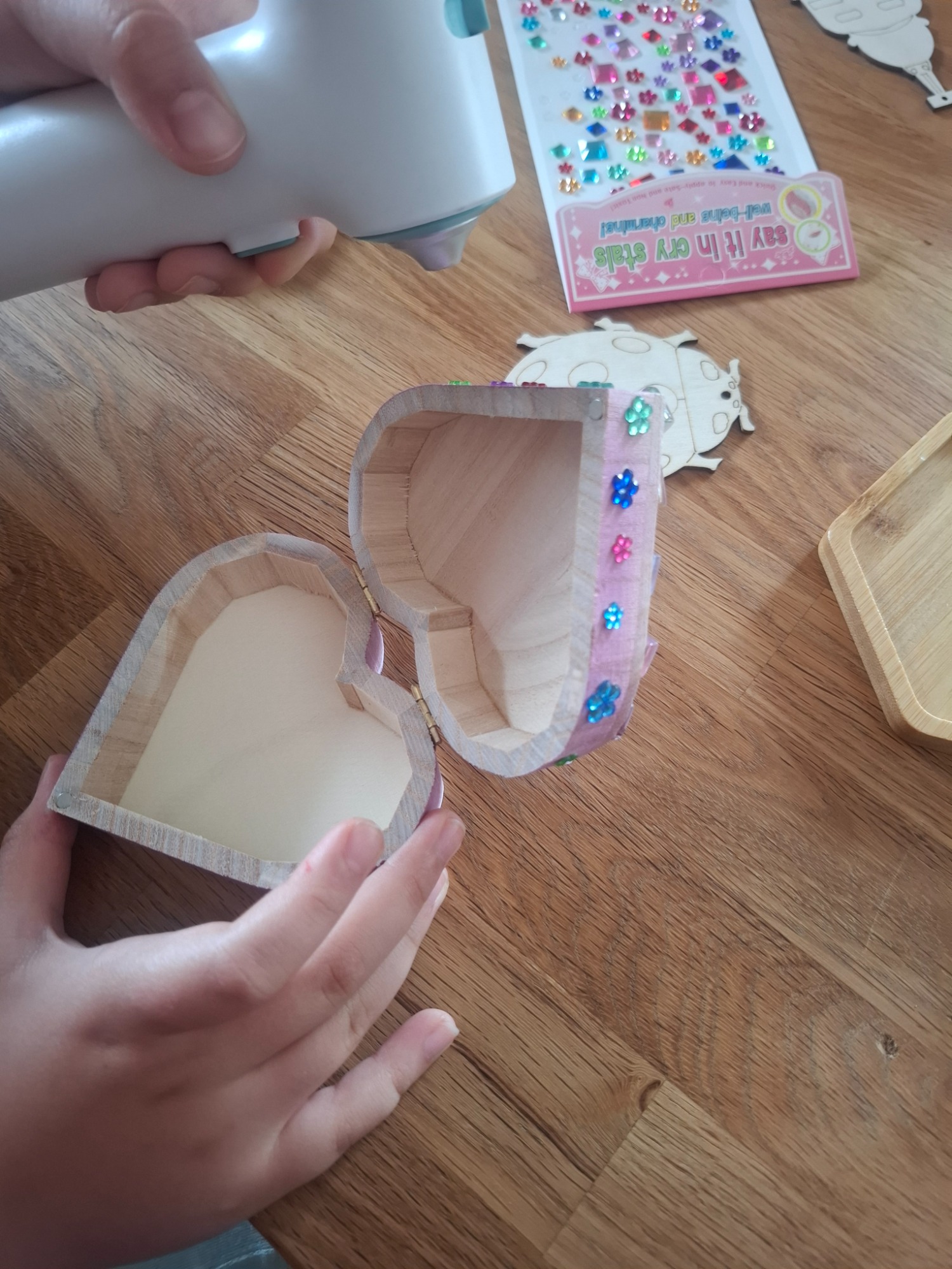 Dabei arbeiten wir mit den verschiedensten Materialien. Unter anderem mit Papier, Dekokarton, Holz, Modelliermasse, Glas, Steine, Textilien und weiteren aktuellen Materialien.